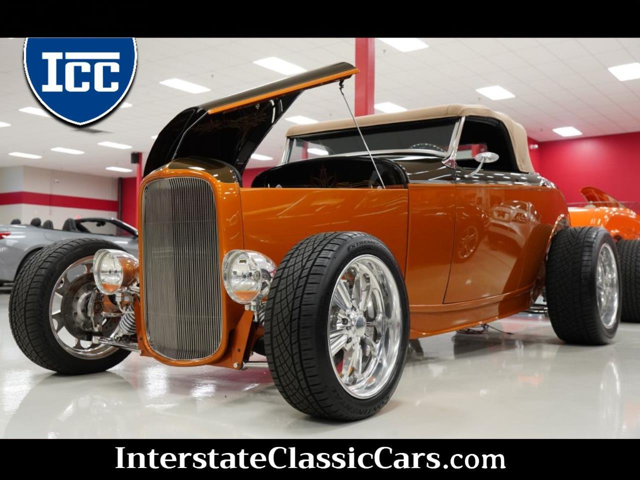 1932 Ford hot rod is a steel-bodied roadster that was built circa 2011, reportedly by Pagano Rod and Custom of Rancho Corodova, California. Mounted on a Roadster Shop chassis, the Dearborn Deuce steel body has been painted metallic brown and copper with a beige soft top and a side-hinged hood, and it is powered by a 5.7-liter LS6 V8 paired with a four-speed automatic transmission. It rides on adjustable coilovers with a Heidts independent rear suspension assembly, double-staggered Budnik wheels, rack-and-pinion steering, and four-wheel disc brakes. Interior appointments include two-tone leather upholstery, square weave carpets, air conditioning, power windows, a Budnik steering wheel, and a Lokar shifter. Dearborn Deuce ‘32 steel body is finished in copper and metallic brown with pinstriping and flourishes, and it is mounted to a Roadster Shop boxed steel frame that is painted to match the lower bodywork. The hideaway folding soft top is beige canvas with a glass rear window, and it stows beneath a hard tonneau. The car has integrated turn signals in the headlights, a chrome grille insert, dual mirrors, and a chopped windshield. Budnik 17” front and 20” rear wheels are wrapped in 215/45 and 295/45 Continental tires, respectively. The car rides on a fully independent suspension with adjustable coilovers at all four corners, rack-and-pinion steering, tubular front control arms, and a Heidts rear subframe. Braking is handled by power-assisted four-wheel discs with inboard-mounted rear units and a booster mounted below the floor. Custom bench seat and door panels are trimmed in beige leather with brown accents that complement the lower dashboard covering. Gray square weave carpets with brown binding line the floors, and a Lokar shifter has been installed along with power windows and a climate control system with air conditioning and heat. Budnik steering wheel is mounted to a tilting column and sits ahead of a 140-mph speedometer, an 8k-rpm tachometer, and a combination gauge six-digit odometer indicates 2,700 miles on the build. Sleek Style with Extra Clean Trunk upholstery complements the cabin, and a compartment on the lid houses a set of tools. The 5.7-liter LS6 V8 is equipped with a polished intake manifold, body-color ignition coil covers with custom Cannon Special lettering, and short-tube exhaust headers connected to a stainless-steel dual exhaust system. The firewall has been smoothed and the wiring is hidden. Power is sent to the rear wheels through a four-speed automatic transmission, and suspension components were chromed. Complete Build is Fully Documented and includes Binder and staged photos during build.